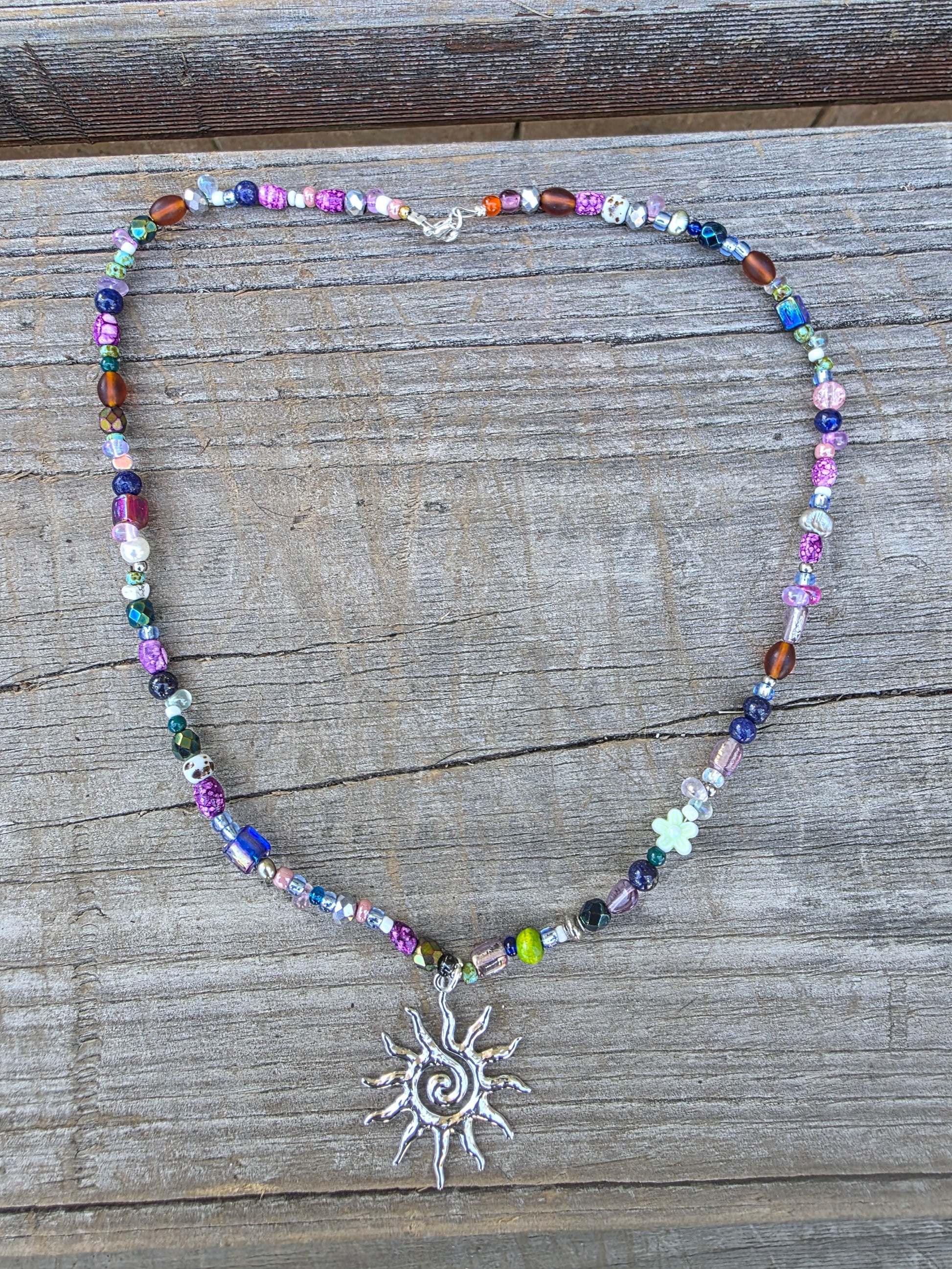 Colourful beaded necklace with a silver sun pendant